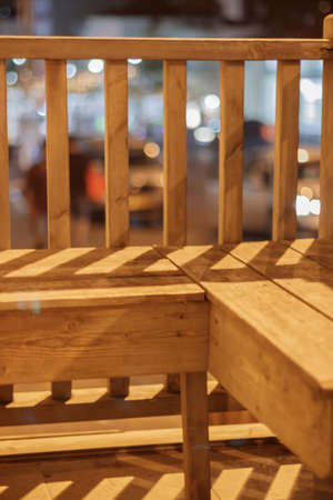Wooden seat outside. Bench for rest. A place to relax on the street. City furniture.
