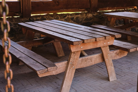Picnic table Wooden table with benches traveling camping site Breakfast outside