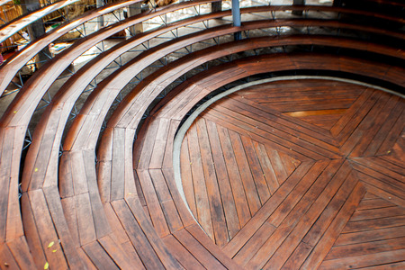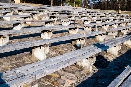 Empty wooden benches of brown color are in outdoors theater