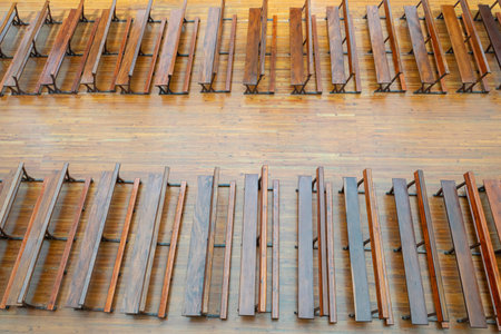 Rows of church benches at the old european catholic church.