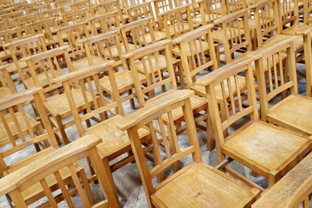 Wooden chairs in a row in a church.