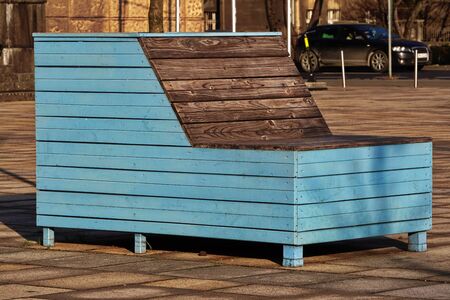 blue wooden bench with pot for a tree on a Sunny day, the city recreation, ecological leisure area.