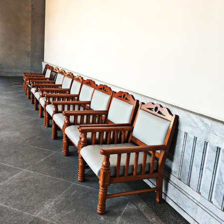 Wooden chairs in the lobby of the airport, blurred background.