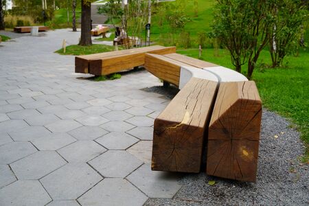 wooden bench with concrete in the park. Modern and classic together.
