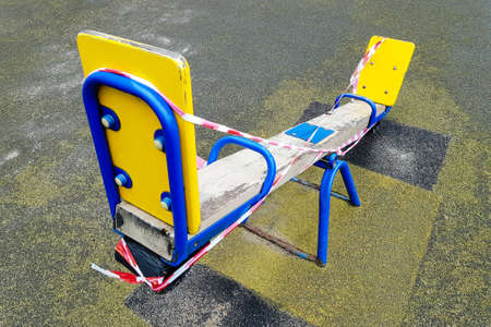 Children's swing on a playground in a recreation park wrapped with red barrier tape. Prohibition of outdoor walks, prevention of the biological hazard of the coronavirus influenza virus covid-19. risk