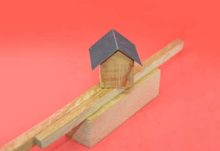 Architectural composition of the modules of the house surrounded by wooden figures on a the red background