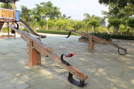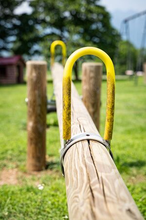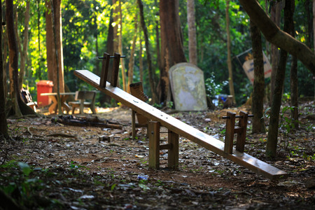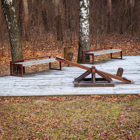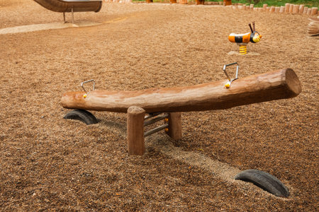 In a peaceful forest, a sturdy wooden seesaw offers children a delightful space for playful activities that promote enjoyment, cooperation, and balance during their outdoor adventures