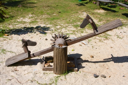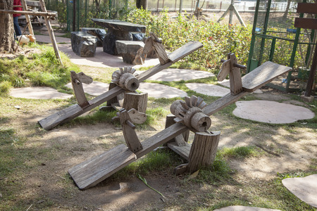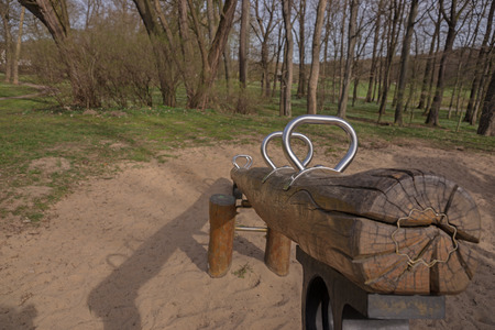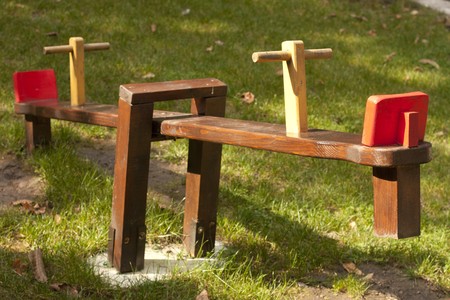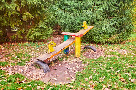 The handmade wooden teeter-totter with carved horse heads on kids playground, surrounded with spruces, Kyiv, Ukraine