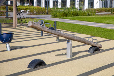 Childrens playground with a safe rubber coating in the courtyard of a modern residential complex. Swings and other equipment for outdoor activities. Well-organized relaxation space