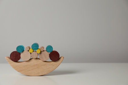 Wooden balance toy on white table near light gray wall, space for text. Children's development