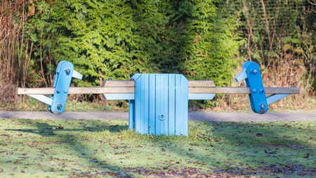 New modern plastic bright colorful blue and red empty toy seesaw swing on nursery playground with soft rubber flooring on bright sunny summer day. Perfect place for children activities outdoors.