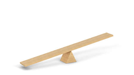 3d rendering of a light wooden seesaw with the left side leaning to the ground on white background.