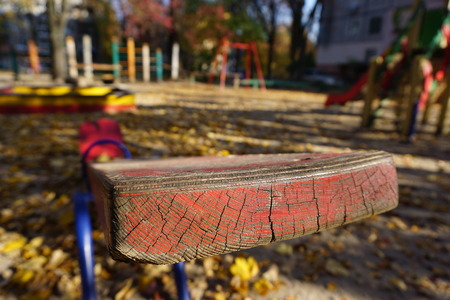 A playground with a red shawl for two children. Old peeling paint, sunny golden autumn. Yellow leaves lie on the ground under your feet .
