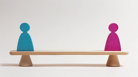 Wooden seesaw with a pink female symbol on one end and a blue male sign at the other, white background, concept of gender balance and innocence,