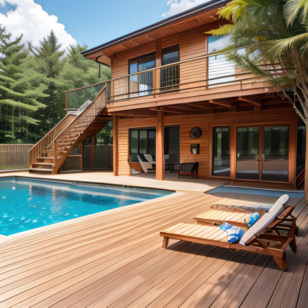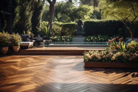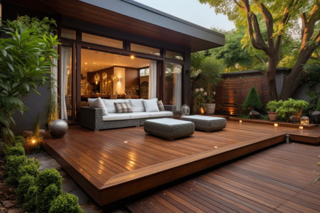 The exterior of a back garden patio area with wood decking. Generative AI technology