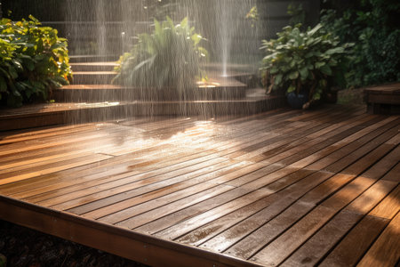 sprinkler system, with water cascading down the steps of a wooden deck, created with generative ai