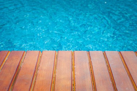 Wooden long chair with blue water of swimming pool in the background. (Selective focus)