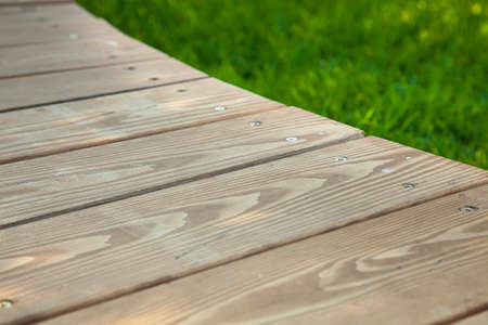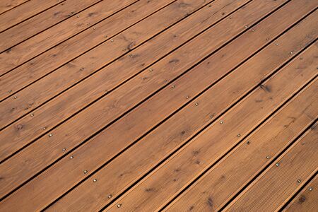 Natural outdoors wooden board floor. Brown floor fixed with screws pins.
