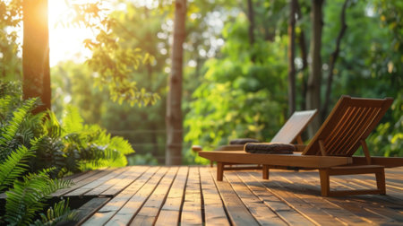 wooden deck with comfortable lounge chairs and view of the garden, created with generative ai