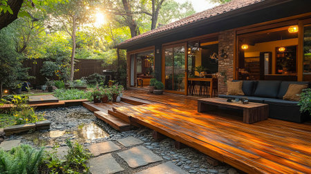 Stylish wooden deck surrounded by lush greenery in a cozy backyard with sunlight creating a warm and inviting ambiance.