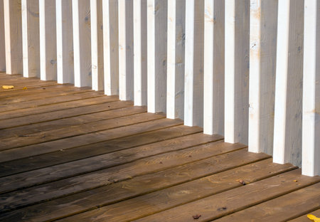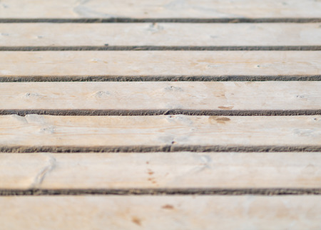 Old weathered white boards on a jetty or outdoor deck in a close up oblique angle view