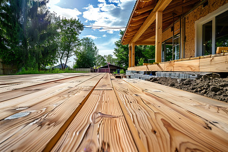 The Natural Beauty of a Wooden Deck Framed by the Soft Palette of Cloudy Skies and Greenery