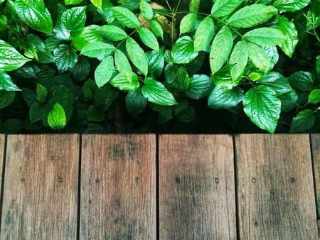 A serene top view of a wooden deck featuring fresh green foliage, creating a tranquil outdoor environment ideal for relaxation and leisure activities.