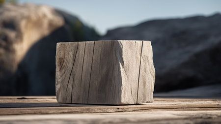 Wooden cube on a wooden table in front of a mountain landscape
