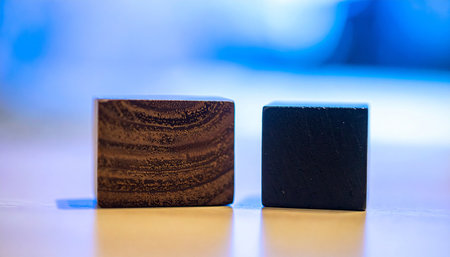 Two wooden blocks, one natural wood grain and one black, are positioned side by side on a reflective surface.