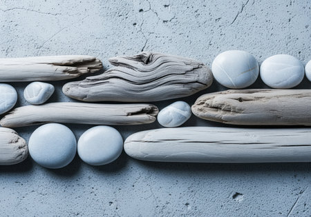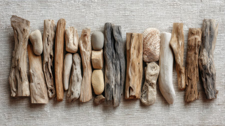 A visually appealing arrangement of smooth stones, driftwood, and shells on a soft gray surface, showcasing nature's beauty and diversity in texture and shape.