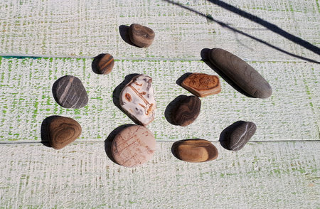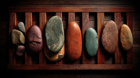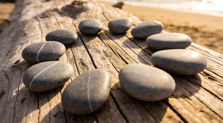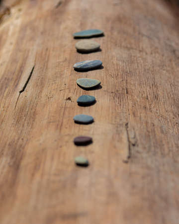 small flat rocks on the wooden beam