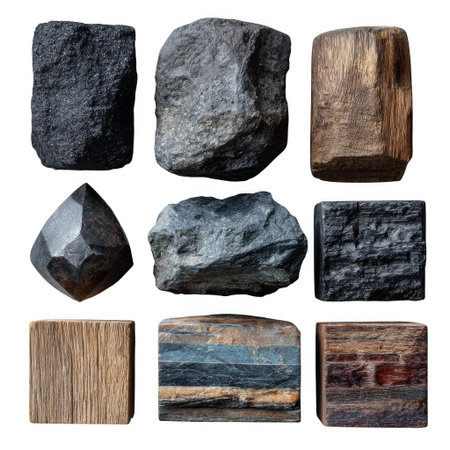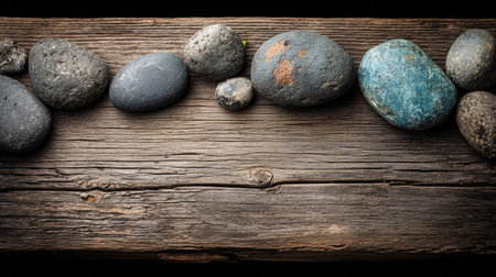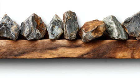 A collection of assorted rocks rests upon a rustic wooden plank. The composition features a variety of shapes and textures, with neutral colors dominating the scene. The lighting appears soft, highlighting the natural forms. This image could be suitable for educational materials or design projects.