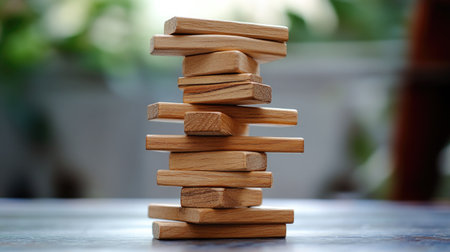 This image showcases creatively arranged wooden blocks stacked on a table, ideal for children's play or educational activities, emphasizing balance and creativity.