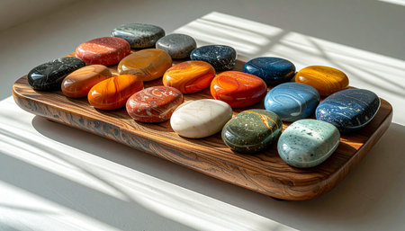 A vibrant collection of polished gemstones rests on a rustic wooden tray, bathed in the warm, natural light of the morning sun.