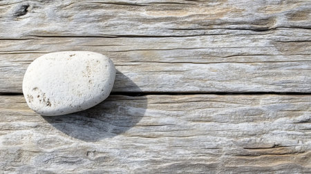 A smooth white stone rests on a simple wooden surface, creating a serene composition. The natural textures and minimalistic design highlight calm and beauty in a harmonious setting.