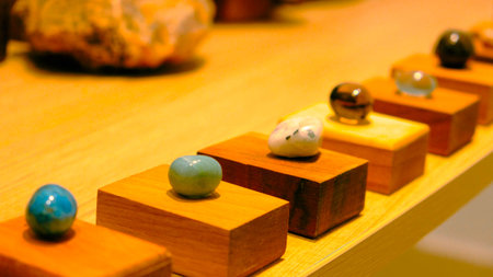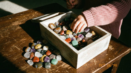 A close-up shot of a hand in a pink sweater picking a polished stone from a wooden box full of various colorful crystals and minerals on a vintage wooden table.