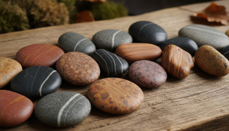 Natural river pebbles in various earthy colors like gray, brown, and reddish tones, scattered across a rustic, textured wooden surface. Smooth, polished stones create a serene, organic composition with soft green moss in the background.
