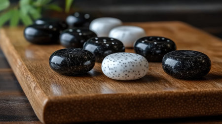A captivating arrangement of smooth black and white stones on a wooden board, creating an elegant and serene aesthetic for home decor or relaxation spaces.
