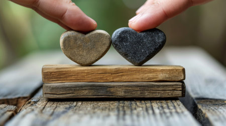 Two hands holding two hearts on a wooden table, AI
