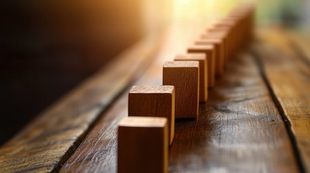 This image features a linear arrangement of wooden blocks on a rustic wooden surface, showcasing warm lighting and a soft focus to enhance creativity and design elements.