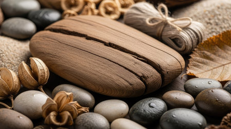 A wooden element rests on a bed of smooth, grey pebble stones. Surrounding the main subject are dried botanicals and a roll of twine, suggesting a natural and neutral aesthetic. The composition features soft lighting and a shallow depth of field, appropriate for diverse commercial applications.