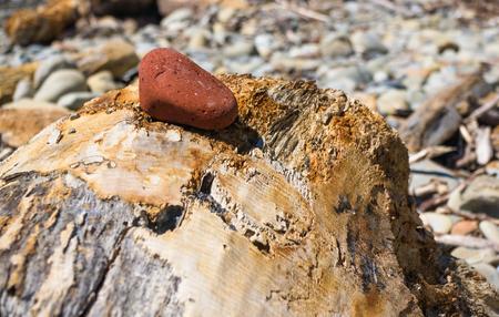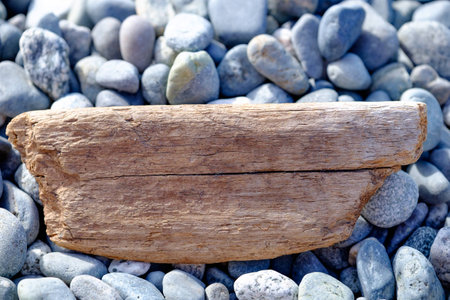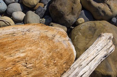 driftwood, washed up by the sea on a pebble beach on a warm summer day