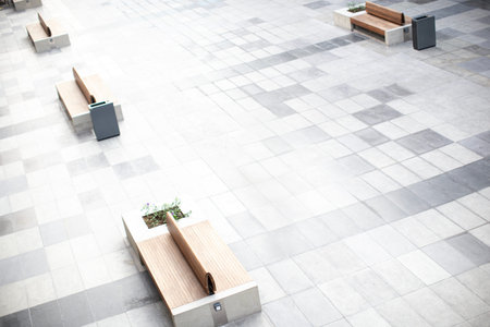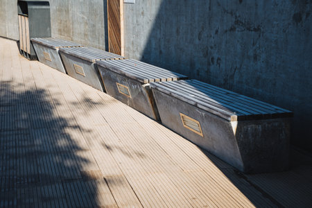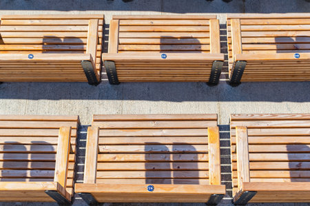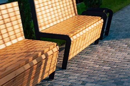 Empty modern wooden benches without people on a sunny day, public places in the city park. City improvement, urban planning, public spaces, recreation area. City public anti-vandal furniture for rest