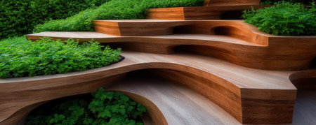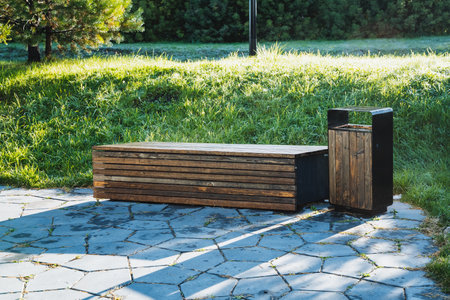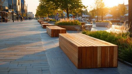 Modern wooden bench urban park city street outdoor seating sunset green plants relaxation contemporary design peaceful atmosphere