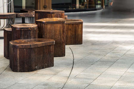 Table and benches set made of wooden on leisure corner. Concept of Place to sit and relax, design furniture made of wooden, Copy space, Selective focus.