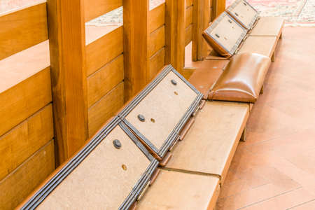 kneeler with leather cushion to support the knees of the faithful who pray in a Catholic Italian church