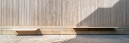 A sleek wooden bench is positioned against a light wooden wall. The minimalist design creates a calm and tranquil atmosphere in the indoor environment, highlighting simplicity.
