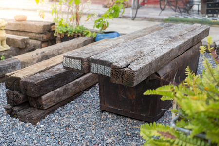 Recycle wooden chair made of wooden railway sleepers in train station.