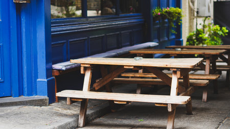 The wooden tables and benches in a cafe by the street