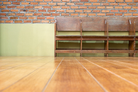 Connecting wooden chairs with brick wall background in a classroom.